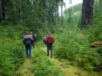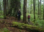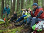 With ten hikers, we approached Main Lake Provincial Park from the west and hiked into a valley with a number of large Douglas firs. The biggest has a diameter of nearly 8 meters. We hiked up the dis-used logging road with Alders growing over it and into the dense forest on an already quite dark day. Following a flagged route we crossed the saddle and descended into the protected valley. Progress was fairly slow navigating the deadfall even with a path. After admiring the group of big trees near the small creek, we continued on toward Clear Lake. With water levels already quite high, some continued on to lake views while others started their lunch on the mossy open bluff above the lake. Lunch included contributions of muffins from Julie and smoked salmon from Vic which were much appreciated. As we headed back it began to rain lightly, but it was a gentle day for a forest walk. (4.9 km; 3 hours.)