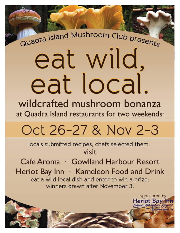 The Mushroom Club will be sponsoring Local Wild Mushroom Delights at Quadra restaurants during the weekends of October 26-27 & November 2-3.